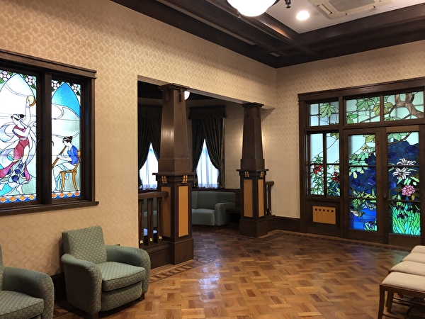 螺旋階段やステンドグラスなどモダンな内装の大広間があるこのお屋敷は、政財界など各方面の著名人や、文化人が集うサロンとなりました。
