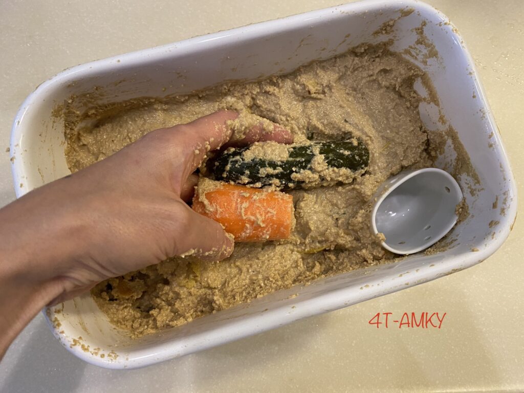 “Nuka-zuke” is a type of traditional Japanese pickles, made by submerging food (esp. vegetables, but also meat, fish, etc) in fermented rice bran paste called nuka-doko. They have been eaten since the early Edo period (17c) in Japan. I think it is great food because it is easy to make, tasty, and good for health.
