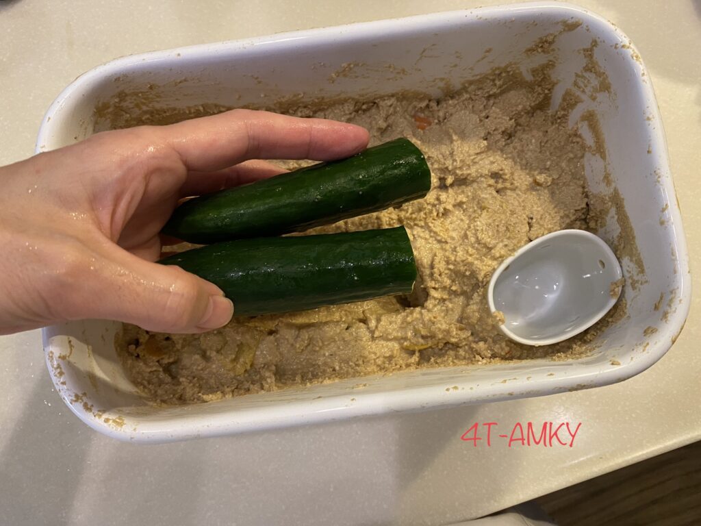 Actually, I bought ready-made nuka-doko three months ago and started to make it at home. I have buried fresh vegetables, mainly a cucumber, in the nuka-doko,